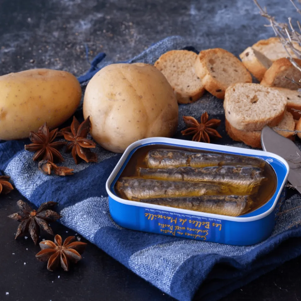 Ferrigno Sardines with Pastis 115g: tinned sardines with olive oil and the famous French drink Pastis, with slight notes of anise, liquorice, and herbs.