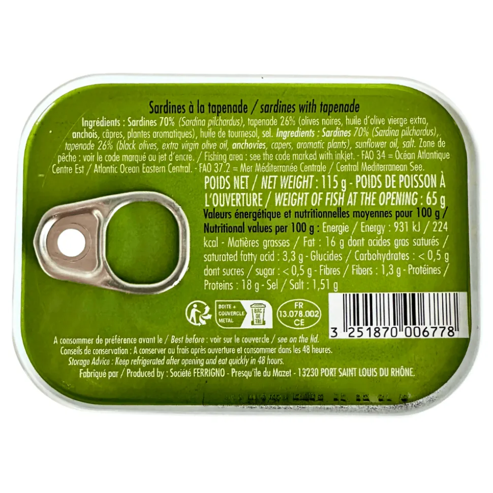 Ingredients: SARDINES (Sardina pilchardus) 70 %, tapenade 26 % (black olives, extra virgin olive oil, ANCHOVIES, capers, aromatic plants), sunflower oil, salt