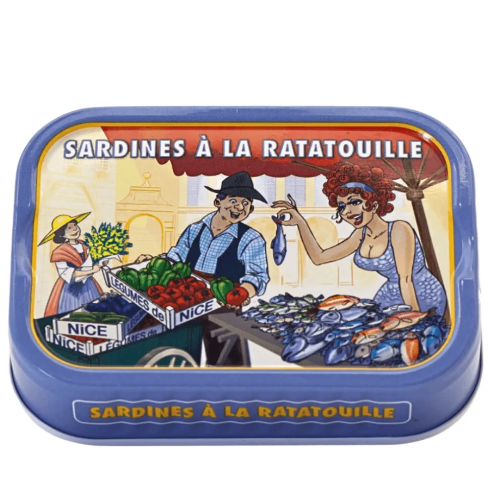 Ingredients: SARDINES (Sardina pilchardus) 60%, ratatouille 40% (water, tomato paste, onions, peppers, aubergine, courgette, extra virgin olive oil, garlic, modified corn starch, spices and aromatic plants, salt)