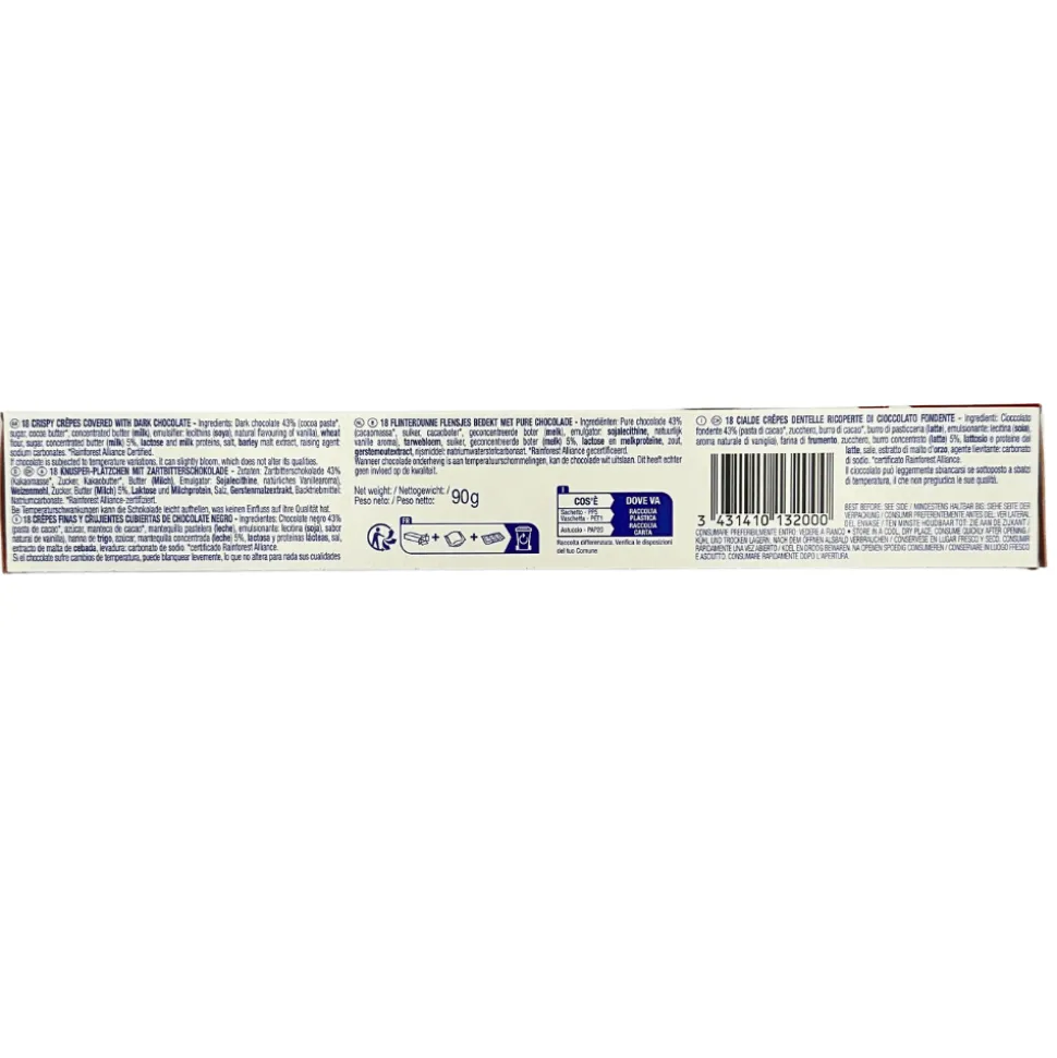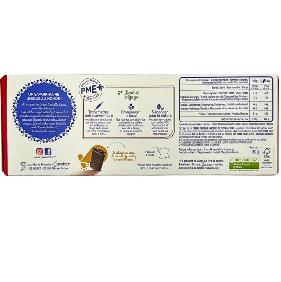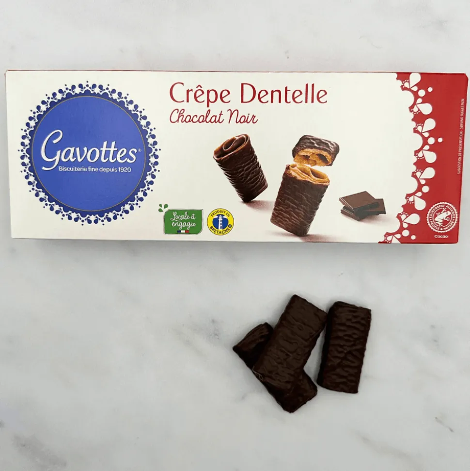 Indulge in the delicate crispiness of Gavottes crepe dentelle with dark chocolate. These signature crepe dentelles are crafted in Brittany, France, following a time-honoured recipe for irresistibly light and flaky layers. Each golden, lace-thin biscuit is carefully rolled and coated in rich, velvety dark chocolate for a perfect balance of crunch and indulgence.