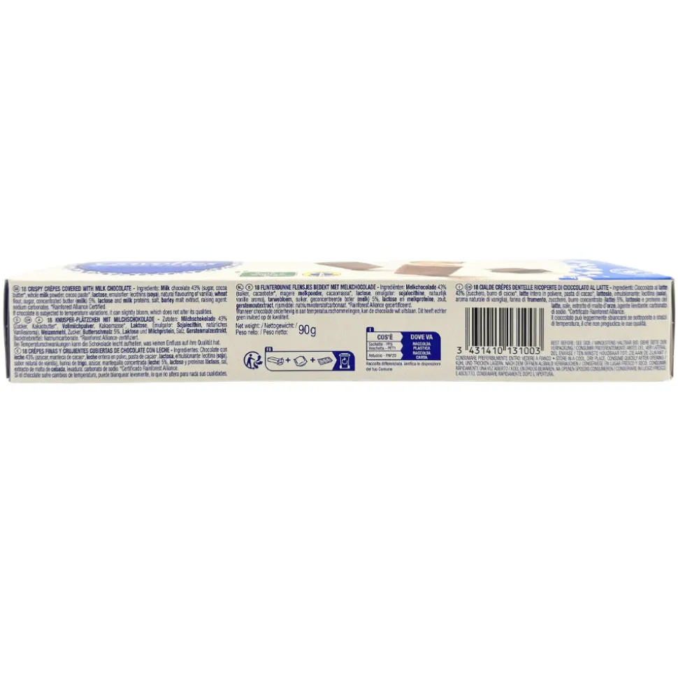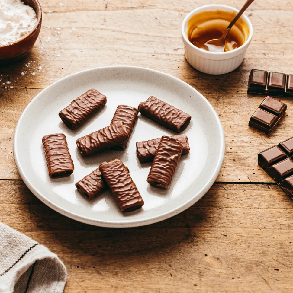 These fine French biscuits are made from folded crepes of buttery caramelised feather-light pastry – and then dipped in milk chocolate for added decadence. As the light crispness of the intricate lace-like structure of the wafers provides a delightful crunch, the chocolate melts in your mouth. These delicate treats are irresistible, whether enjoyed with a coffee, tea or ice cream. They can also add a crunchy texture to cream or pralines to elevate your desserts.