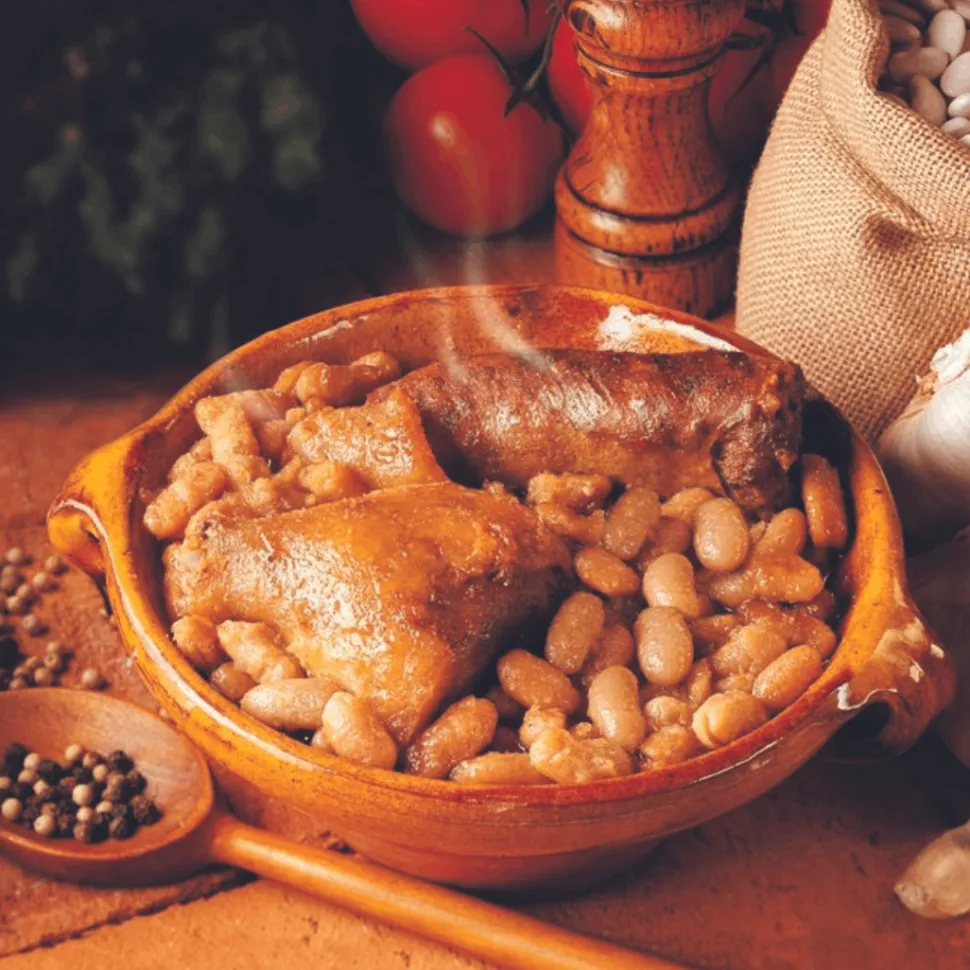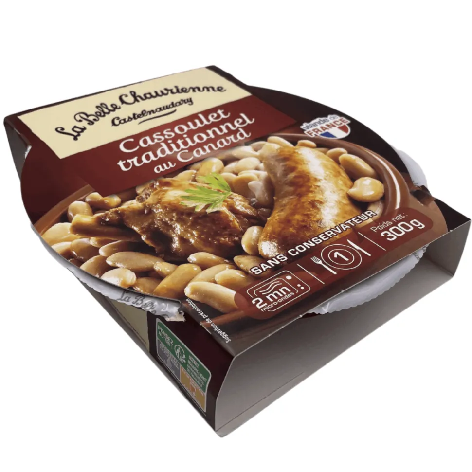 Ingredients: water, tomato puree, salt, duck fat, garlic, pepper, lingots beans 29% – precooked duck drumettes 23% (origin France) salt , grilled Toulouse sausage 16% (origin France), water, natural pork casing, salt, pepper.