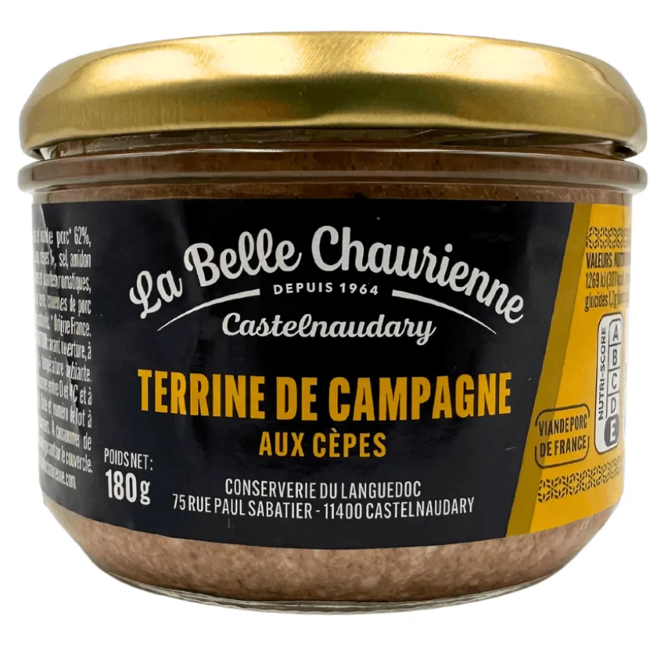 This country terrine is made with French pork meat and liver. Pate de campagne is different from other pates and terrines as it usually made with chunkier meat resulting in a coarse texture and stronger flavours. This La Belle Chaurienne farmhouse pate is with ceps, adding an extra layer of earthy flavour to the umami taste.