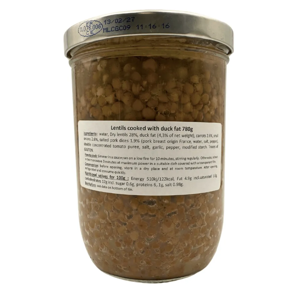 Large, 780g jar of La Belle Chaurienne lentils cooked in duck fat.