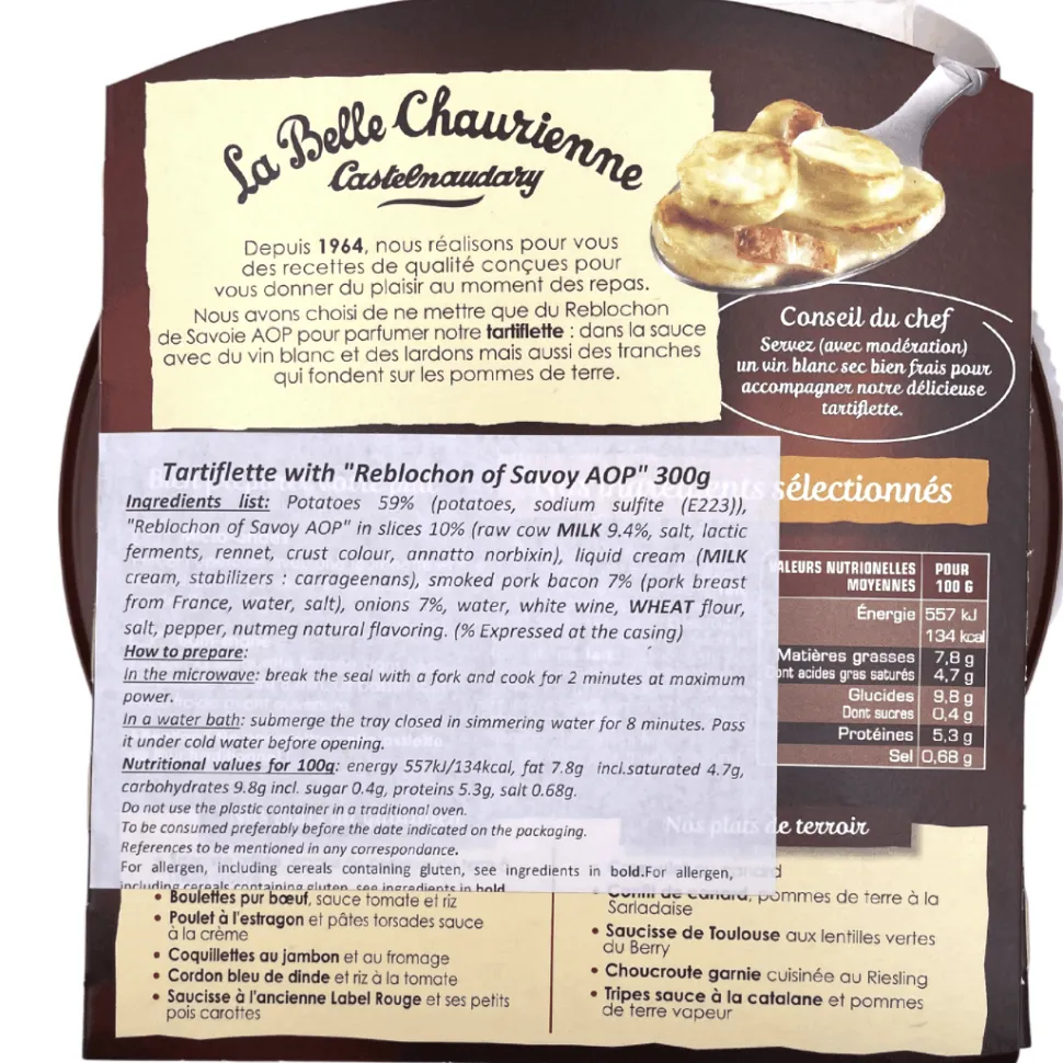Just heat this 300g portion in the microwave or in a bain-marie, and you have a wonderful dish redolent of the mountains. Like all La Belle Chaurienne’s range, this tartiflette is made from authentic French ingredients hand-selected for quality and freshness.