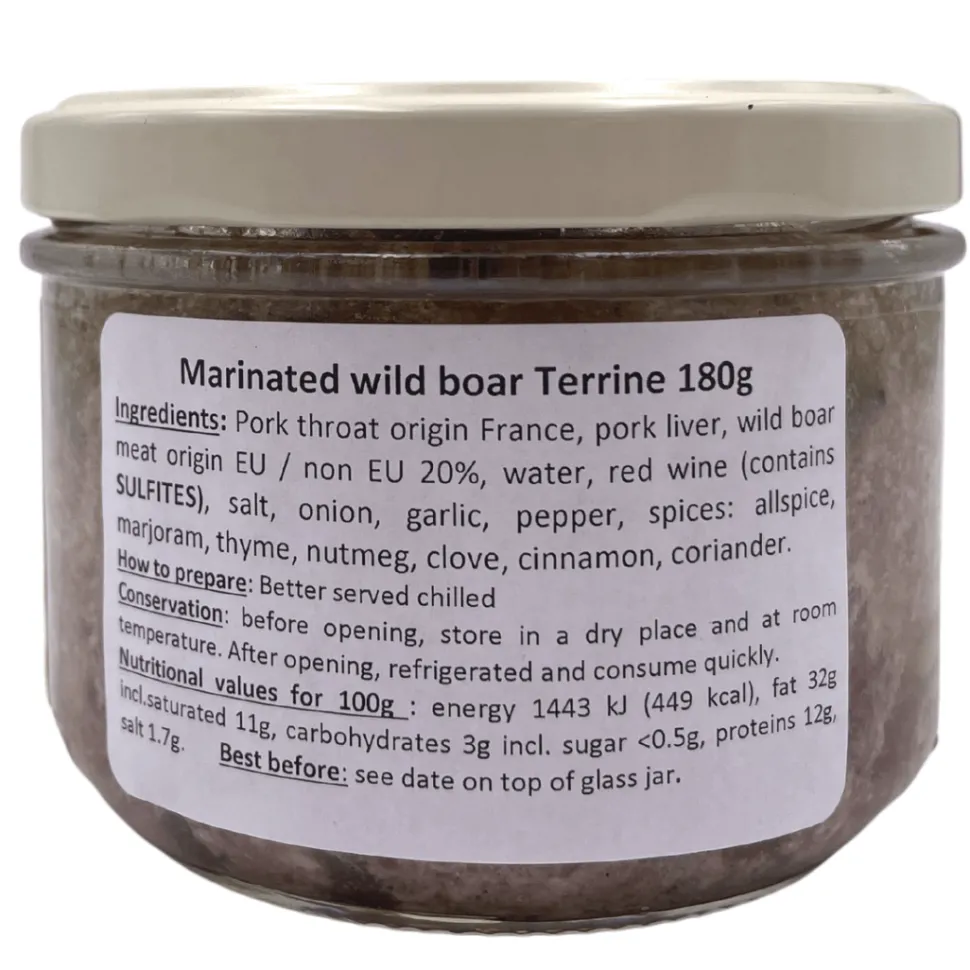 Ingredients: pork meat and fat 37,7% (origin:France), pork liver 30% (origin: France), wild boar meat 20% (origin: EU), water, red wine (contains SULPHITES), salt, onion, garlic, pepper, allspice, marjoram, thyme, nutmeg, clove, cinnamon, coriander.