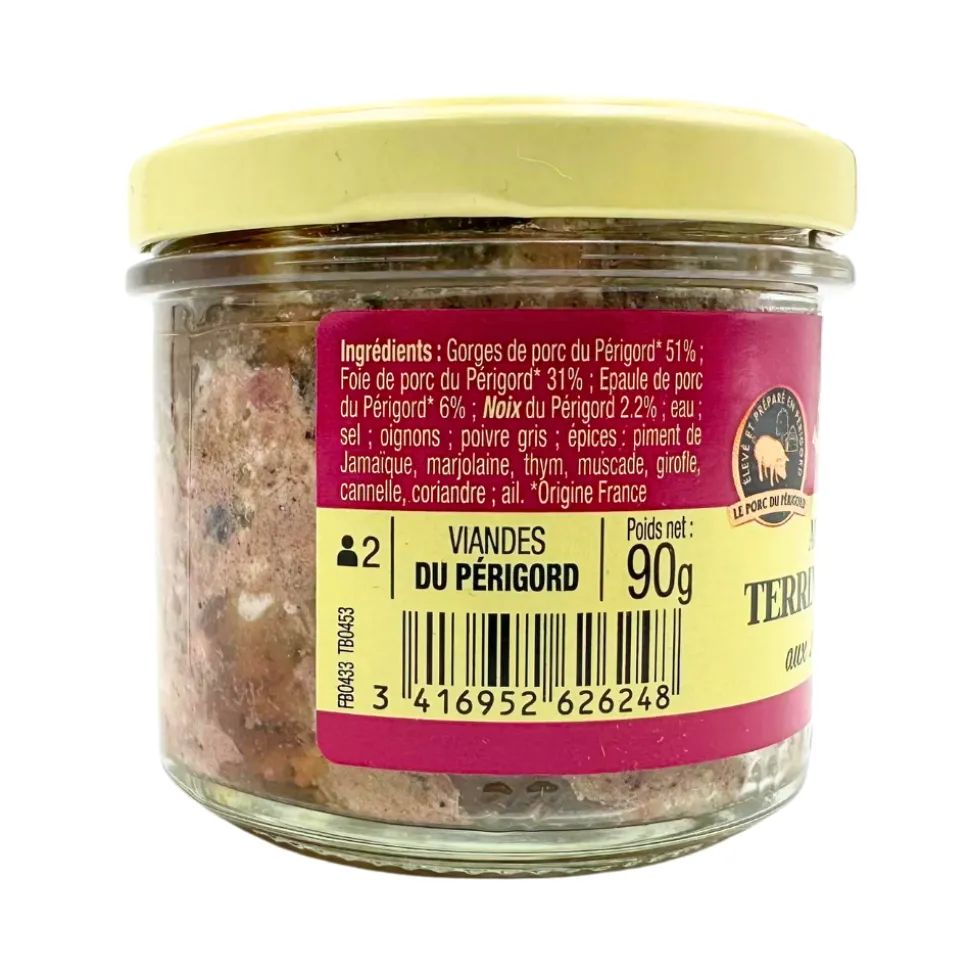 Ingredients – Périgord pork 51%, Périgord pork liver 31%, Périgord pork shoulder 5%, Périgord WALNUTS 6%, water, salt, onions, grey pepper, spices, allspice, marjoram, thyme, nutmeg, cloves, cinnamon, coriander, garlic.