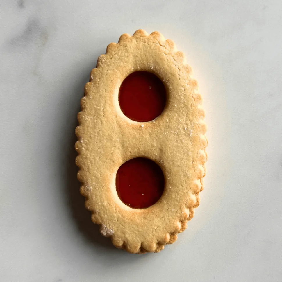 Lunettes de Romans is a classic French biscuit originating from the town of Romans-sur-Isère in southeastern France. These iconic sandwich biscuits are named for their unique “glasses” shape, featuring two layers of buttery shortbread with delicate cutouts, revealing a strawberry filling and topped with icing sugar.