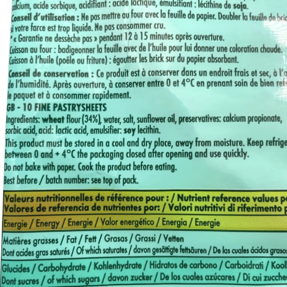 This very thin pastry can easily be folded to make samosas or spring rolls. Traditionally used for a “brick a l’oeuf” (brick with egg) or pastilla, a savoury and sweet pie with meat and nuts covered with crispy layers of brick sheets, brick pastry is very versatile and is perfect for a quick dinner by simply making pastry parcels with meat, fish, vegetables, cheese and more.