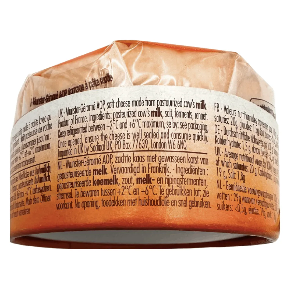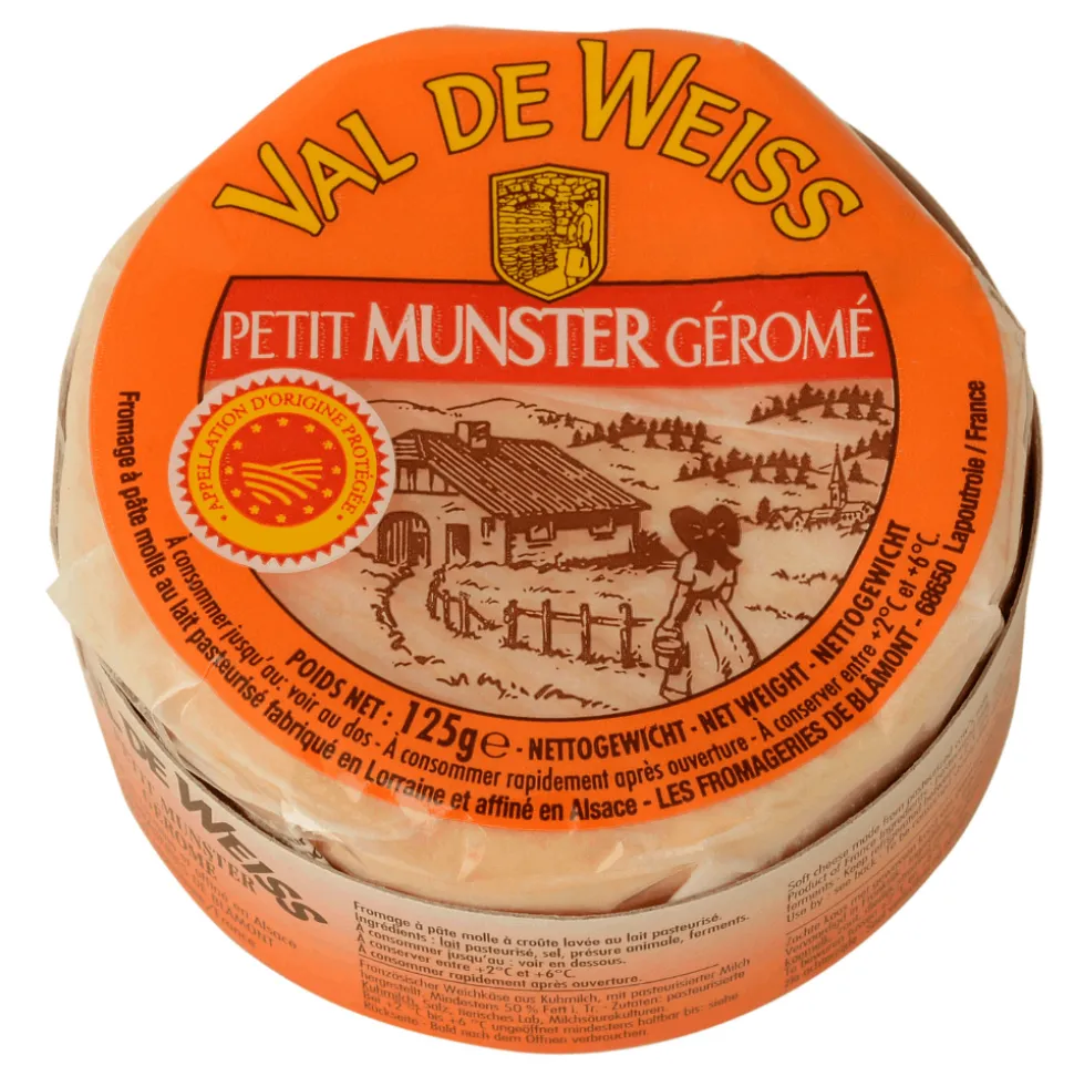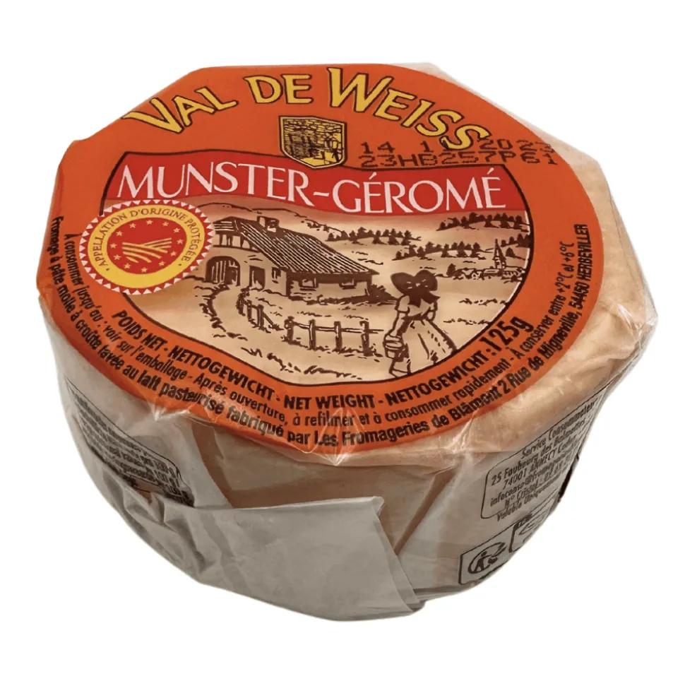 Munster AOP is a soft washed rind cheese with a delicate flavour that is created mostly from milk produced in the Vosges area of France, which is between the Alsace-Lorraine and Franche-Comté provinces. Munster, like other washed rind cheeses, has a slightly damp red coating on the rind due to numerous washings. In addition to protecting the cheese, the rind imparts a powerful, deep scent and acidic flavour. The term “Munster” is derived from the Alsatian town of Munster, where the cheese was stored and aged in monks’ cellars in abbeys and monasteries.