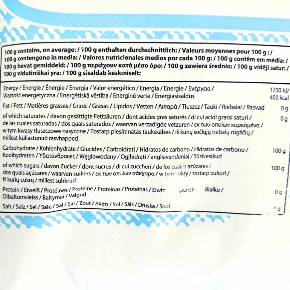 Nutritional values per 100g – 1700kJ / 400kcal, fat: 0g of which saturated: 0g, carbohydrates: 100g of which sugars 100g, proteins: 0g, salt: 0g