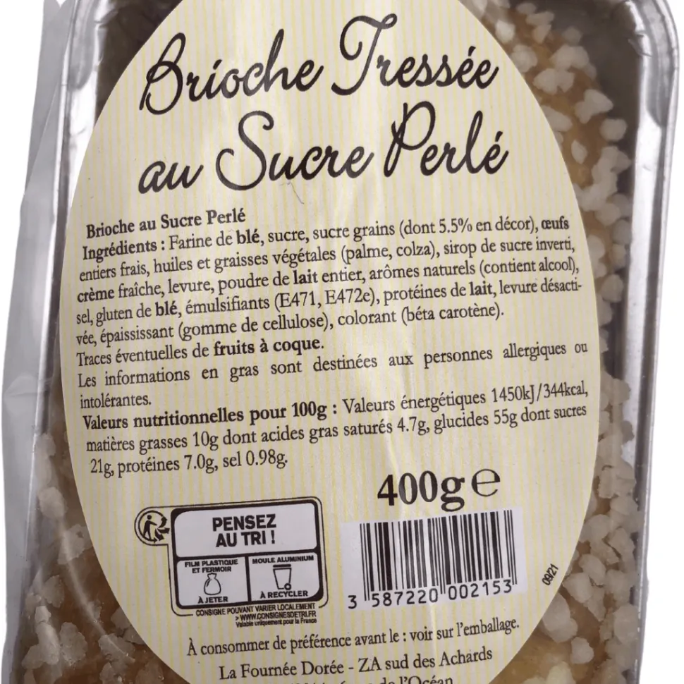 Ingredients: WHEAT flour, pearl sugar (5% on top of brioche), whole fresh EGGS, vegetable oils (palm and rapeseed), inverted sugar syrup, crème fraiche, yeast, full fat MILK powder, natural flavours (contains ALCOHOL), salt, WHEAT gluten, emulsifiers (E471, E472e), MILK protein, deactivated yeast, thickening agent (cellulose gum), colouring (beta-carotene).