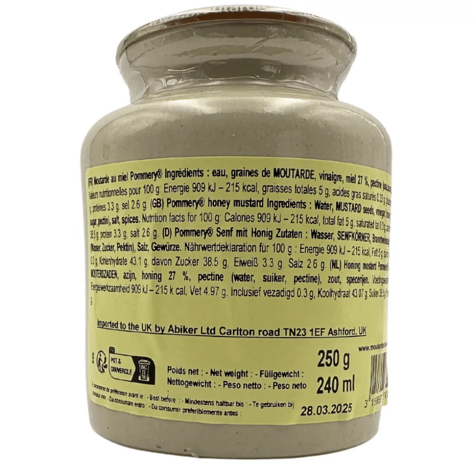 Ingredients – Water, MUSTARD seeds, vinegar, honey (27 %), pectin (water, sugar, pectin), salt, spices.