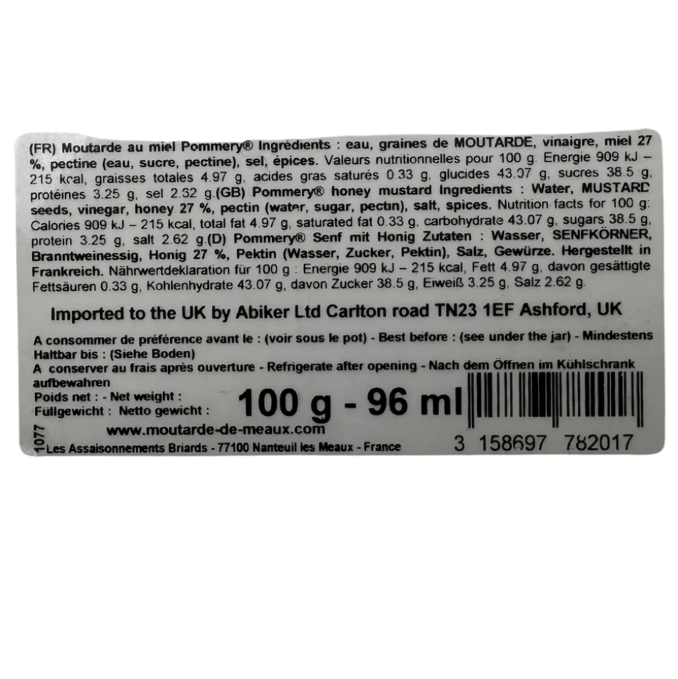 Ingredients: Water, mustard seeds, vinegar, honey 27%, pectin, salt, spices.
