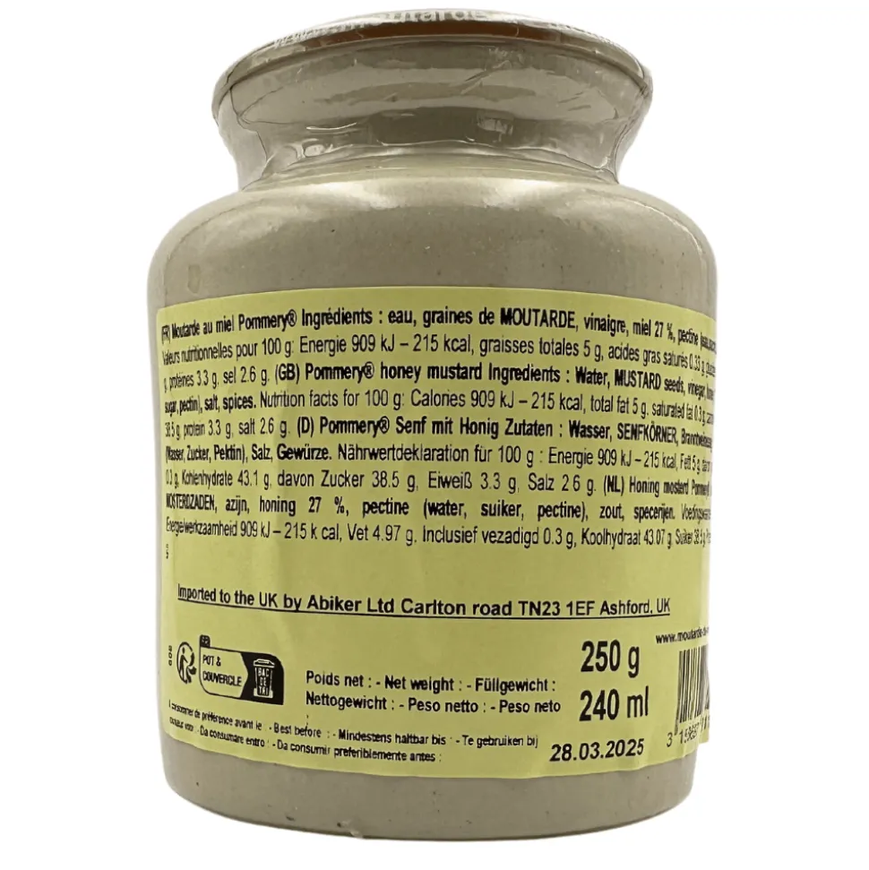 Pommery wholegrain mustard with honey is presented in a stoneware jar with a plastic top.