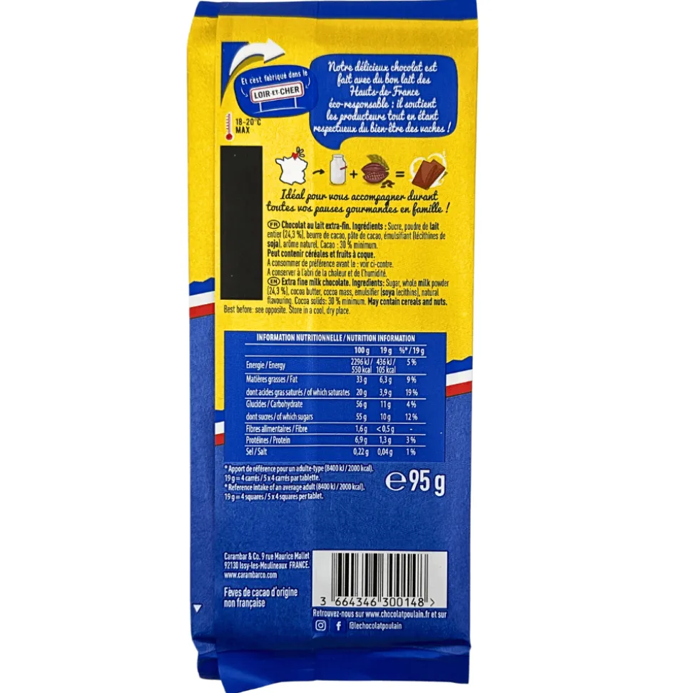 Renowned for its smooth texture and velvety taste, Poulain milk chocolate has been a symbol of French confectionery excellence since 1848. Made with French milk and crafted with care, it embodies the authentic charm of French traditions.