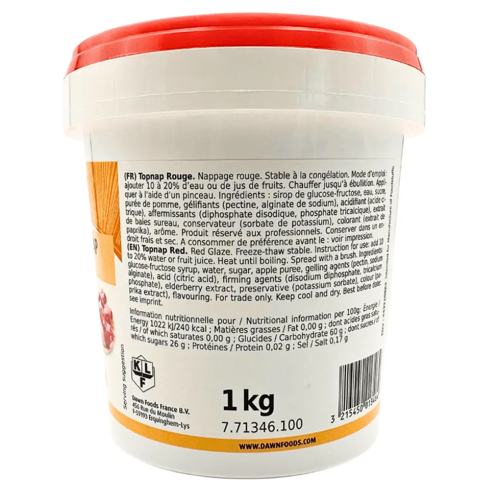 This red glaze is a staple for bakers and patissiers. Add a finishing touch to your creations for extra shine and to lock in the freshness of fruit tarts. The hint of red in the clear glaze will add a touch of vibrancy to your creations, along with an exquisite glossy sheen.