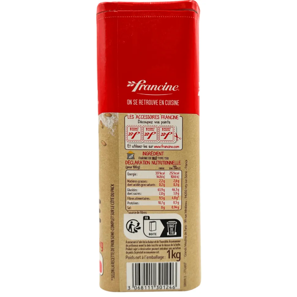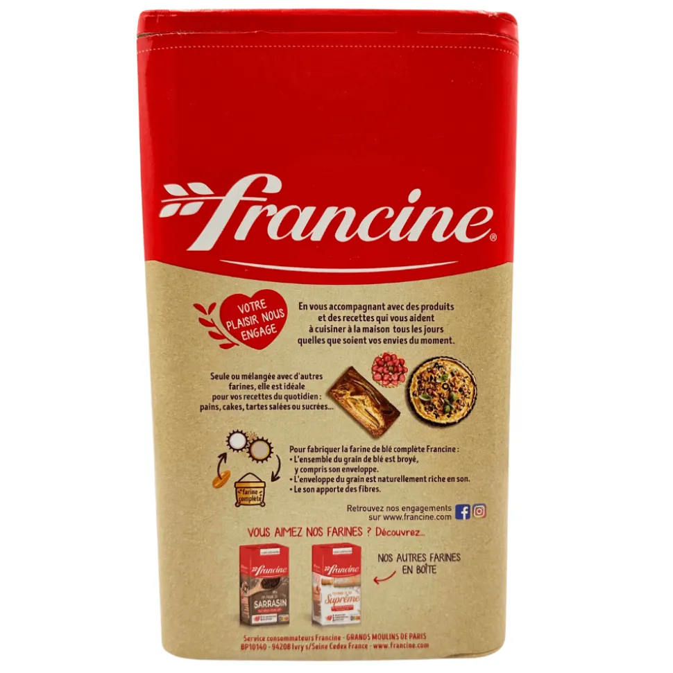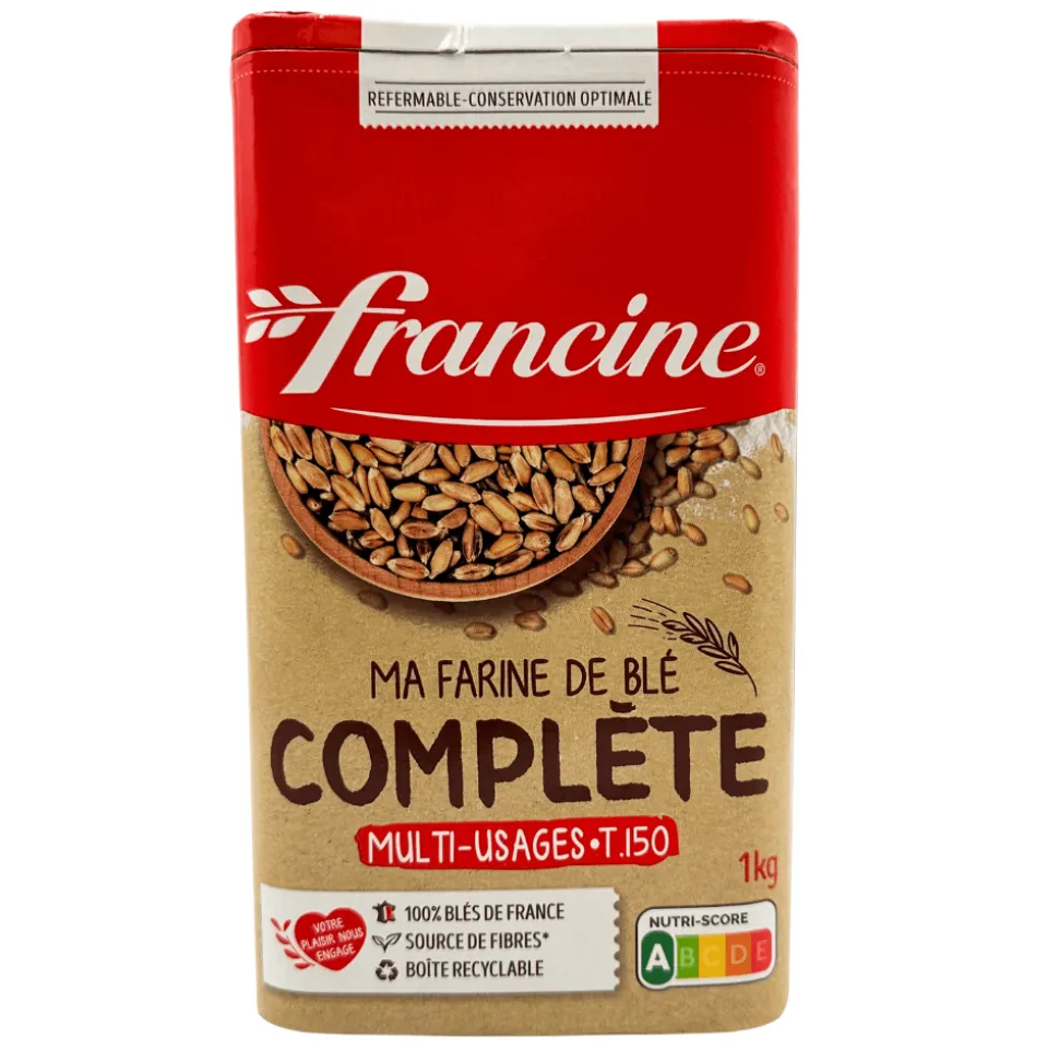 The baker’s favourite: Francine wholemeal flour, a T150 classified wholewheat flour crafted especially for artisan bread-making and traditional recipes. Sourced from a select blend of French wheat varieties, this coarse flour is rich in nutritious wheat germ and fibre, making it an excellent choice for those seeking a wholesome baking experience. Francine wholemeal flour is expertly blended to create doughs with exceptional gluten structure and extensibility. Perfect for producing crusty brown bread, rustic loaves, and many other baked goods made by hand or in a bread maker, this French flour ensures a deliciously authentic taste and texture that’s sure to delight.
