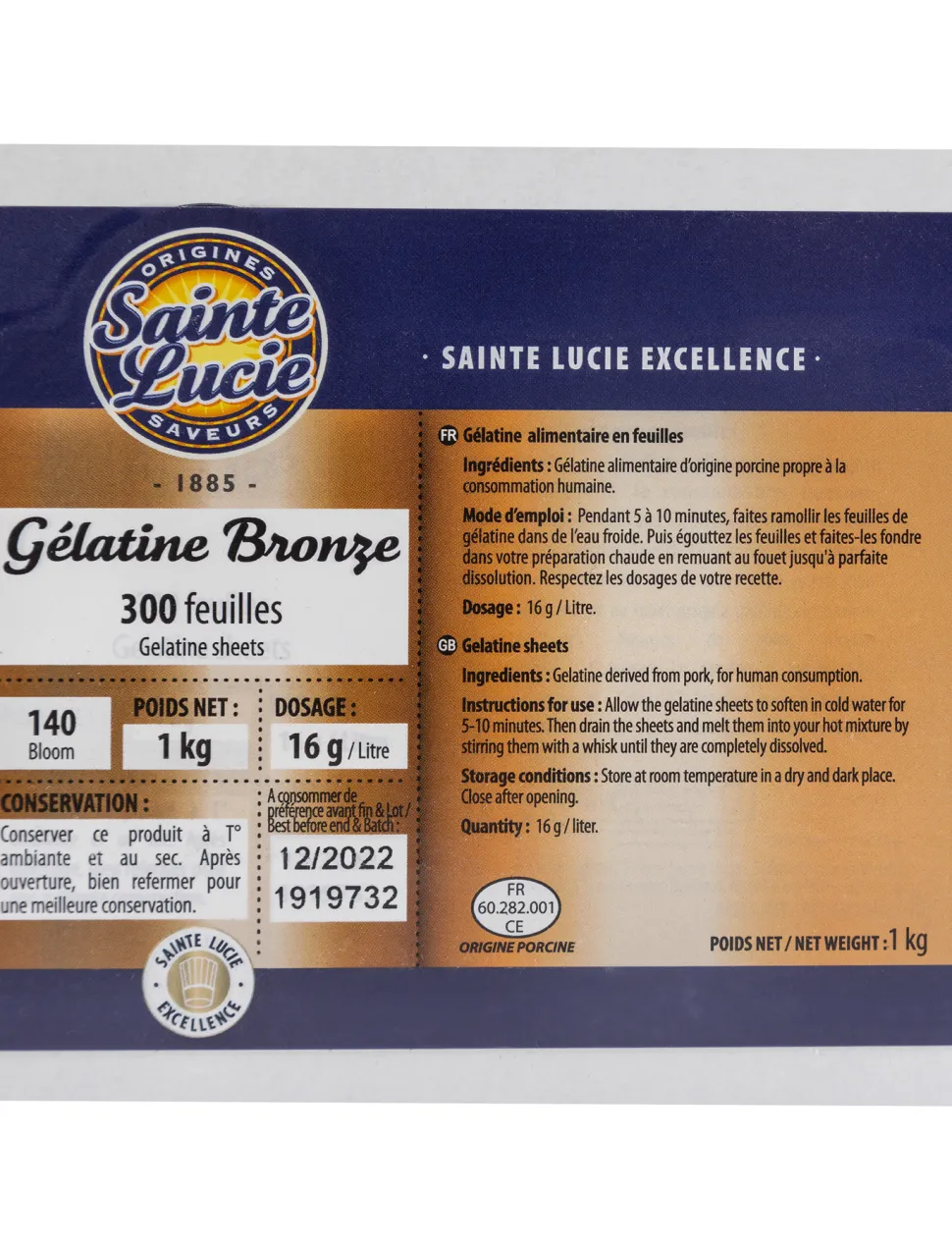 Bronze Gelatine leaves from French company Sainte Lucie, 140 bloom, premium quality. Leaf gelatine tends to be favoured by professionals as it gives a smoother, clearer consistency than powdered gelatine.