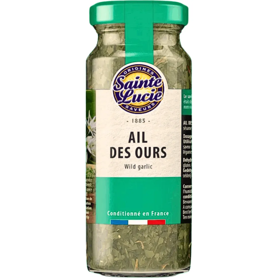 Discover the rich aroma of Sainte Lucie wild garlic, a versatile condiment made from carefully dried and chopped leaves of “ail des ours”. Named “bear’s garlic” in French, it is said that bears feast on these wild leaves after hibernation to regain strength. Its delicate yet bold garlicky flavour makes it a perfect seasoning for soups, salads, omelettes, and homemade pesto recipes. Unlike traditional garlic, wild garlic offers a milder, herbaceous taste with a fresh, slightly peppery note. Sprinkle it into sauces, marinades, or pasta dishes for an aromatic twist. Convenient and easy to use, Sainte Lucie wild garlic brings the essence of the forest to your kitchen, enhancing your dishes with a unique, natural flavour.
