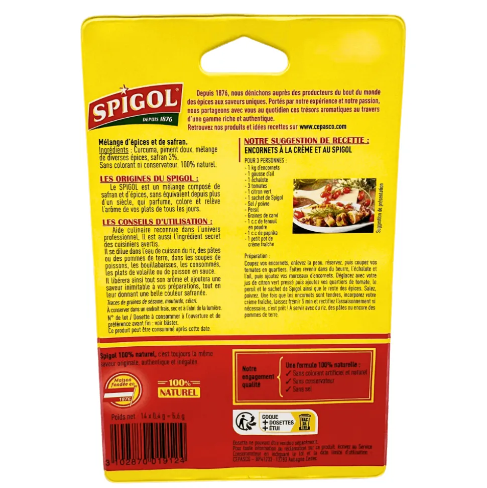 Add a pinch of spice with individual servings of spigol, an original French seasoning that has been a staple in southern France for over 140 years. This unique blend, which includes 3% saffron, adds a depth of flavour to a variety of meals, from hearty soups and rich stews to fish and meat dishes.
