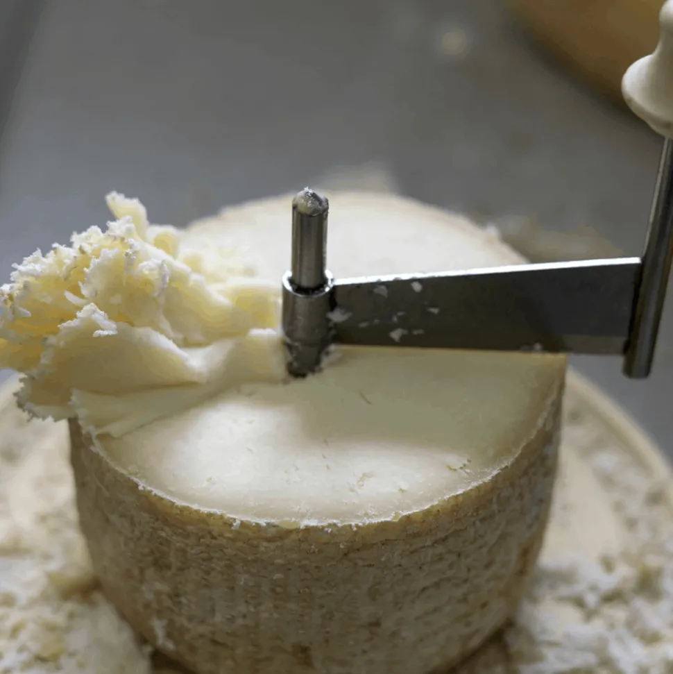 Step 1: Cut the Tête de Moine in two, wrap one half in cling film and place it back in cold storage. If the rind is greasy or sticky, leave your Tête de Moine AOP unwrapped in the refrigerator for one or two hours.