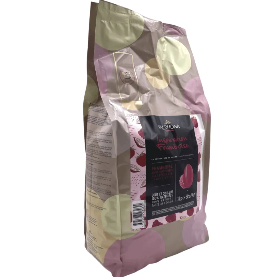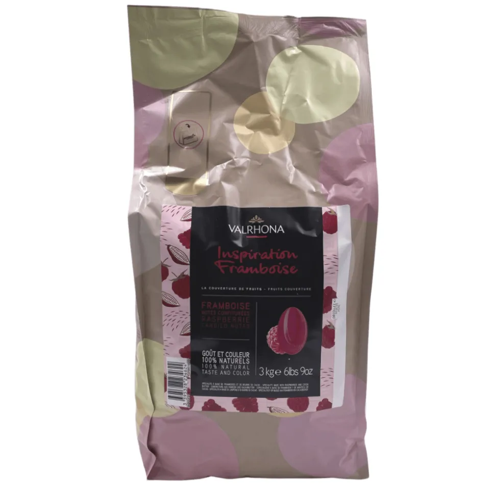 Raspberry Inspiration 3kg bag from luxury French chocolate house Valrhona. Valrhona Raspberry Inspiration is a naturally dairy-free product made with cocoa butter and raspberry that can be used in the same way you’d use chocolate. Perfect for all dessert applications like chocolate making, mousse, ganache.